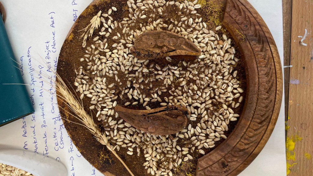 I have tried some natural elements, used real organic materials to express my ideas as wheat, grain,coffee on carved wood.Carving wood was really hard for me so i give up however quite interested in transforming, watch absorb into the wood,reflecting evolution so it was my first try. I engaged touch,smell coffee and also realized that dark stains from coffee symbolize time, nostalgia to me and i loved this artwork because it is about nature.Wood inked to roots, life cycles reminded my childhood as we have used some cooking stuff or for furniture for dining room.This was a place of food as well.Wheat is growth, agriculture, harvest but for me my name and survival although it has soft,tiny and sensible parts.