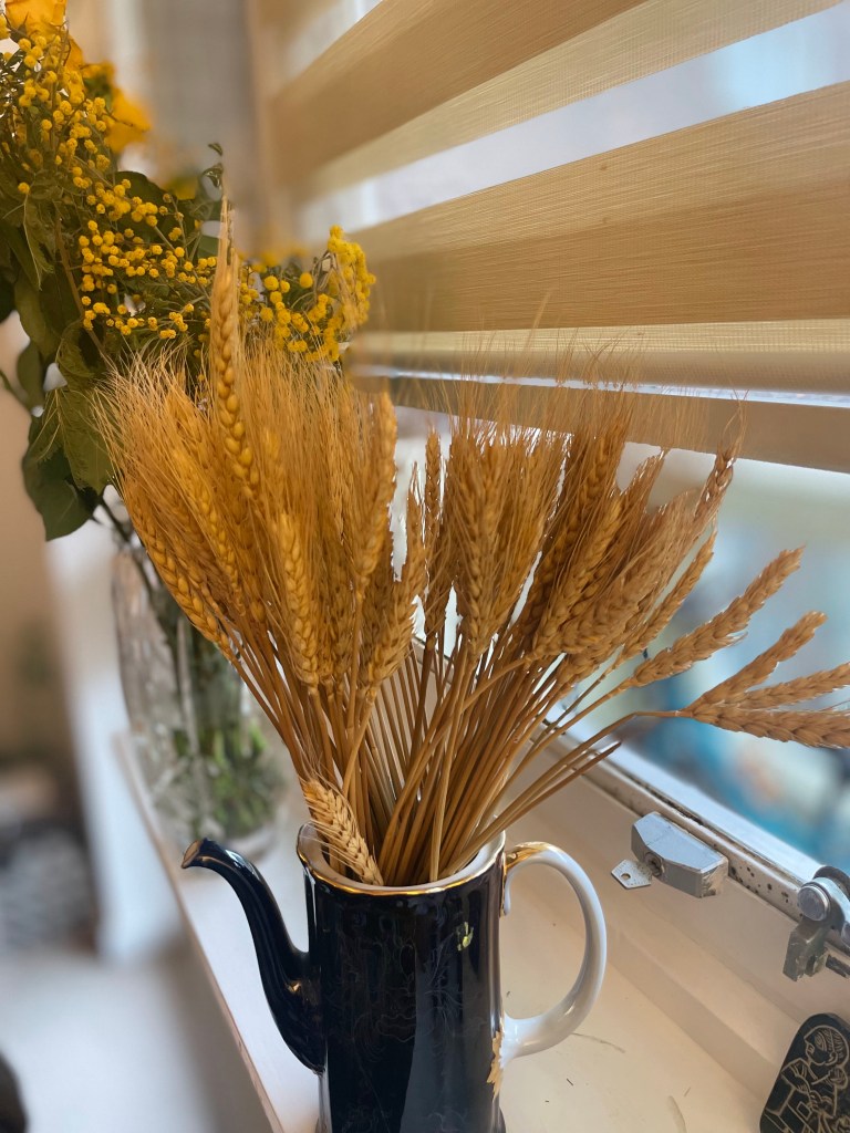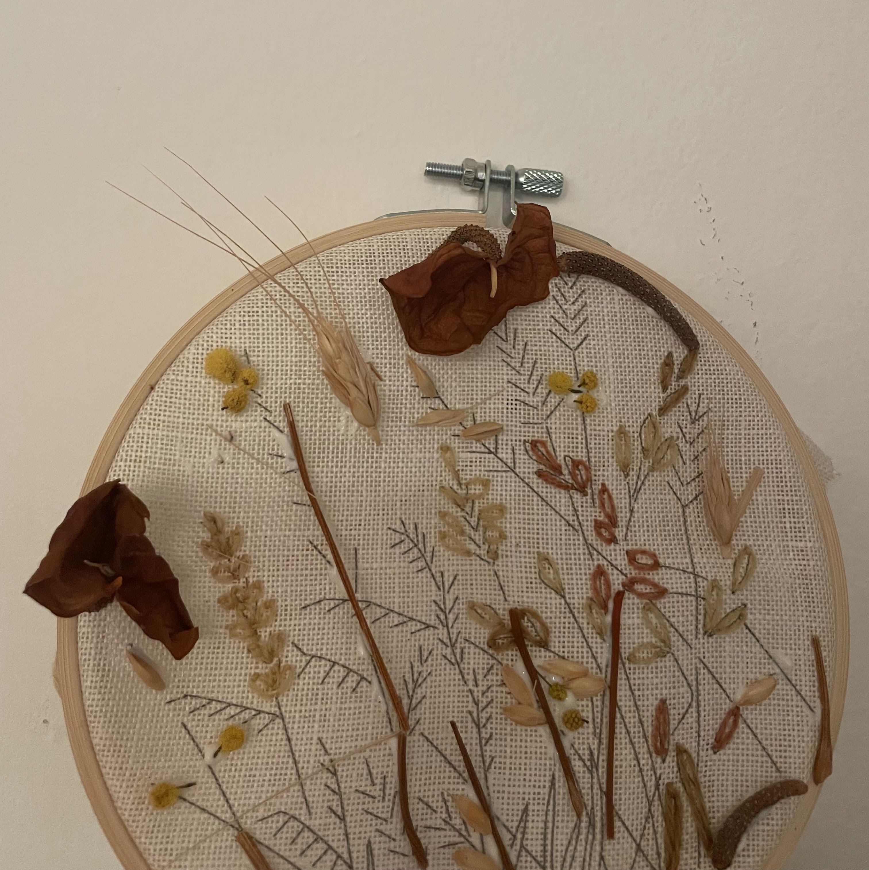 i have added some natural dry flowers and real wheat on my canvas,sticked hardly although canvas texture was delicate it contrasts with embroidery blended traditional handcraft.I believe it connected art and agriculture.This technique invite people to reflect on nature, freedom on art, and heritage.This artwork expressed my memory as my amazing grandma times as human connection to nature.