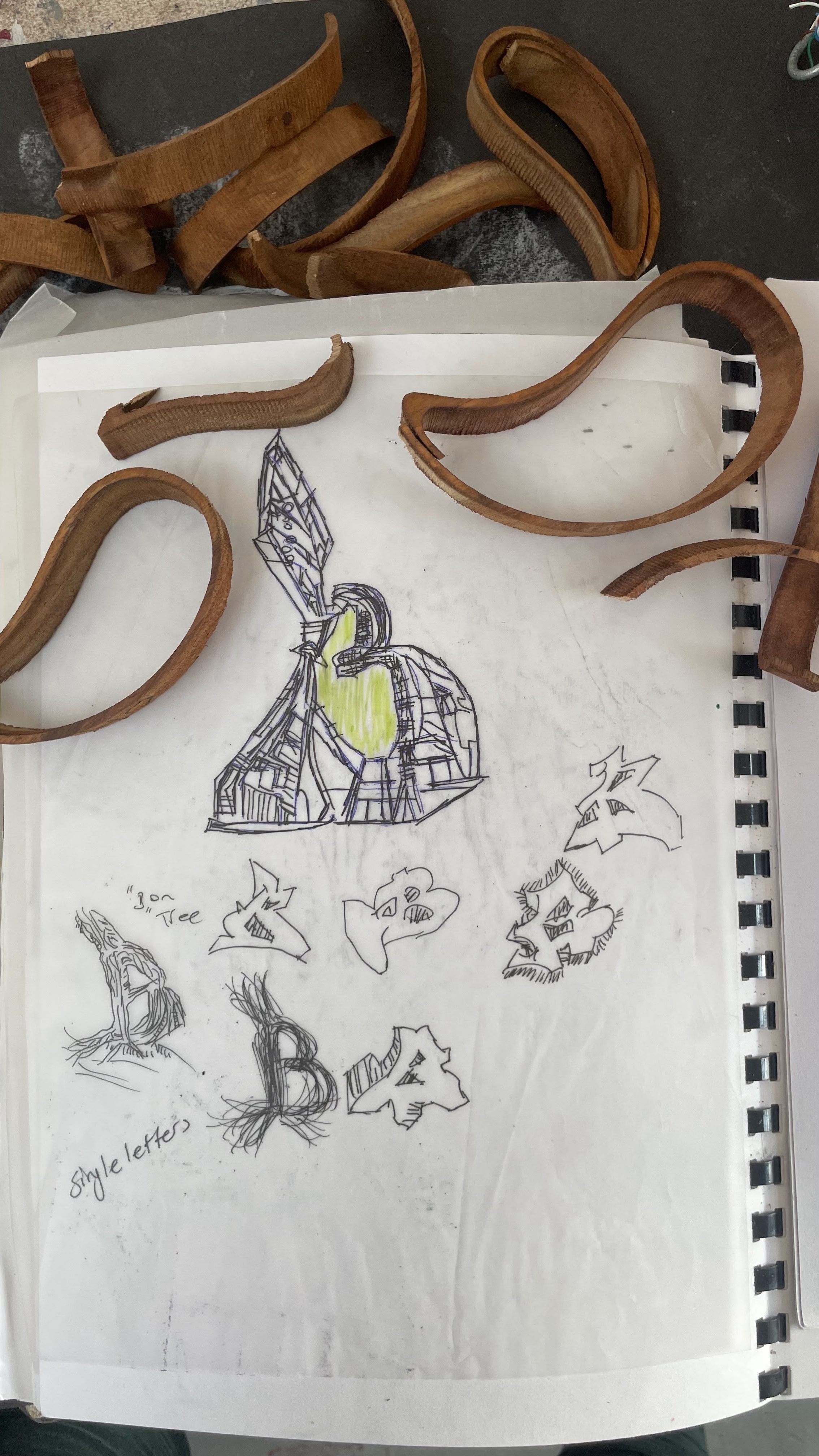 i tried to draw 2 dimentional shapes on my sketchbook also draw B on tree and explored trees characters as i believe every single branch has different characters and have different formations.