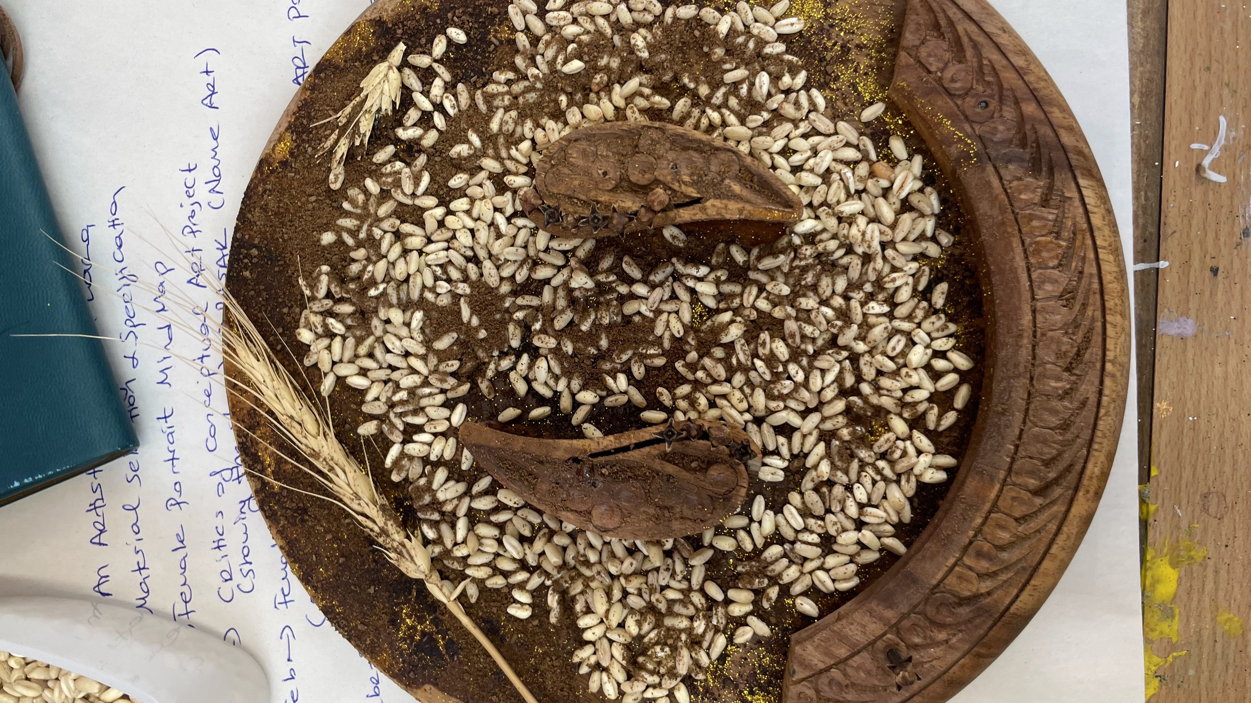 The concept of my artwork I focused on natural elements, tradition, and transformation. Wheat and grain symbolize sustainability, agriculture.Coffee introduces themes of cultural rituals. The use of wood organic, historical connection,growth, harvest also I tried to carve and I believe the concept is strong, but off course it depends my friends and tutors perspective.