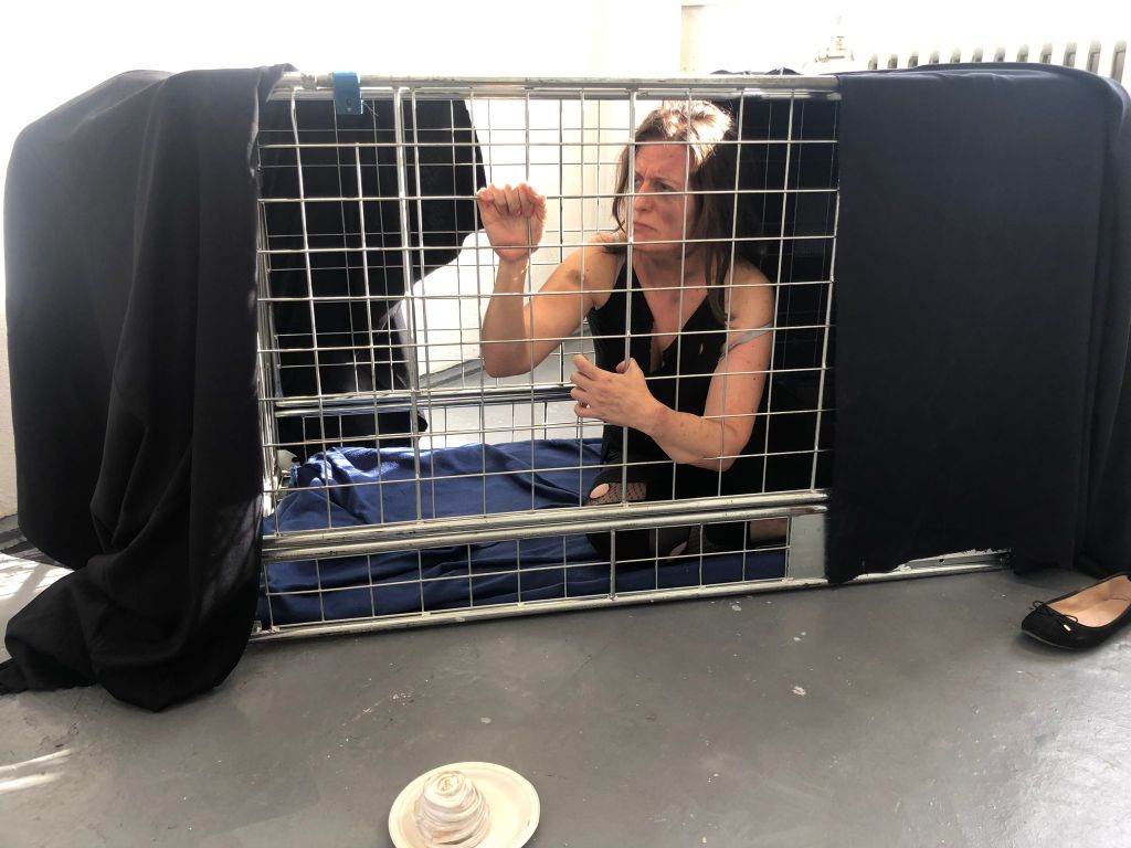 I planned to put the woman body sculpture inside the cage relates to concept of imagination of my performance, a message or an answer can be found.