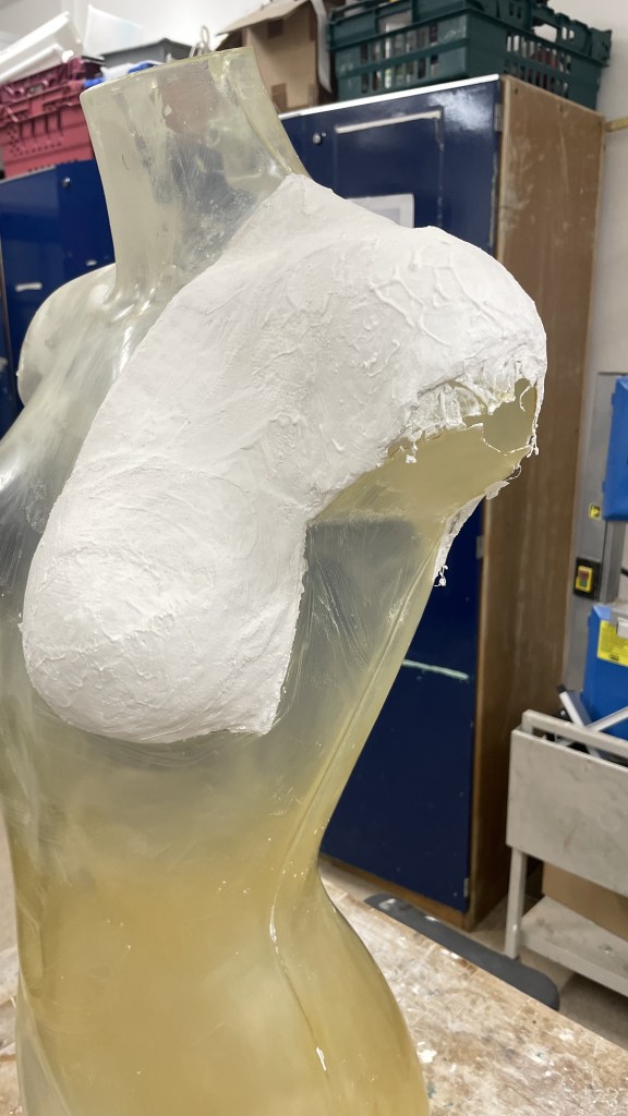 For my sculptures I have used Mod-Roc due to its transparency, durability and ability to be molded.I likely use this plaster also it’s lightweight when cured and easy to shape however I have some concerns to require additional support as the plaster section could unbalance the sculpture, plaster is sensitive to moisture so careful consideration of it and it needs a protective coating to resist moisture and cracking.