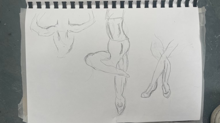 The figures on my sketchbook lines, contrasting smooth curves with sharper anatomical points.