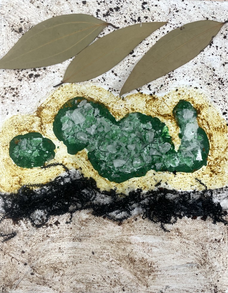 The dried leaves represent movement and life, while the crushed green glass at the center symbolizes regeneration and the delicate balance of nature. The soil and salt provide grounding textures that tie the composition to the earth, creating a layered interplay between rawness and vibrancy. The fabric softens the piece, adding fluidity and contrast.