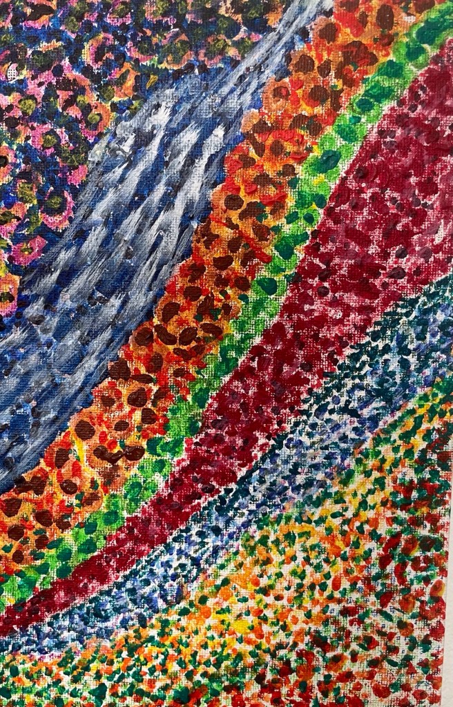 This piece is more structured,seems to be waves with flower roads.I tried to combined pointilist techniques.