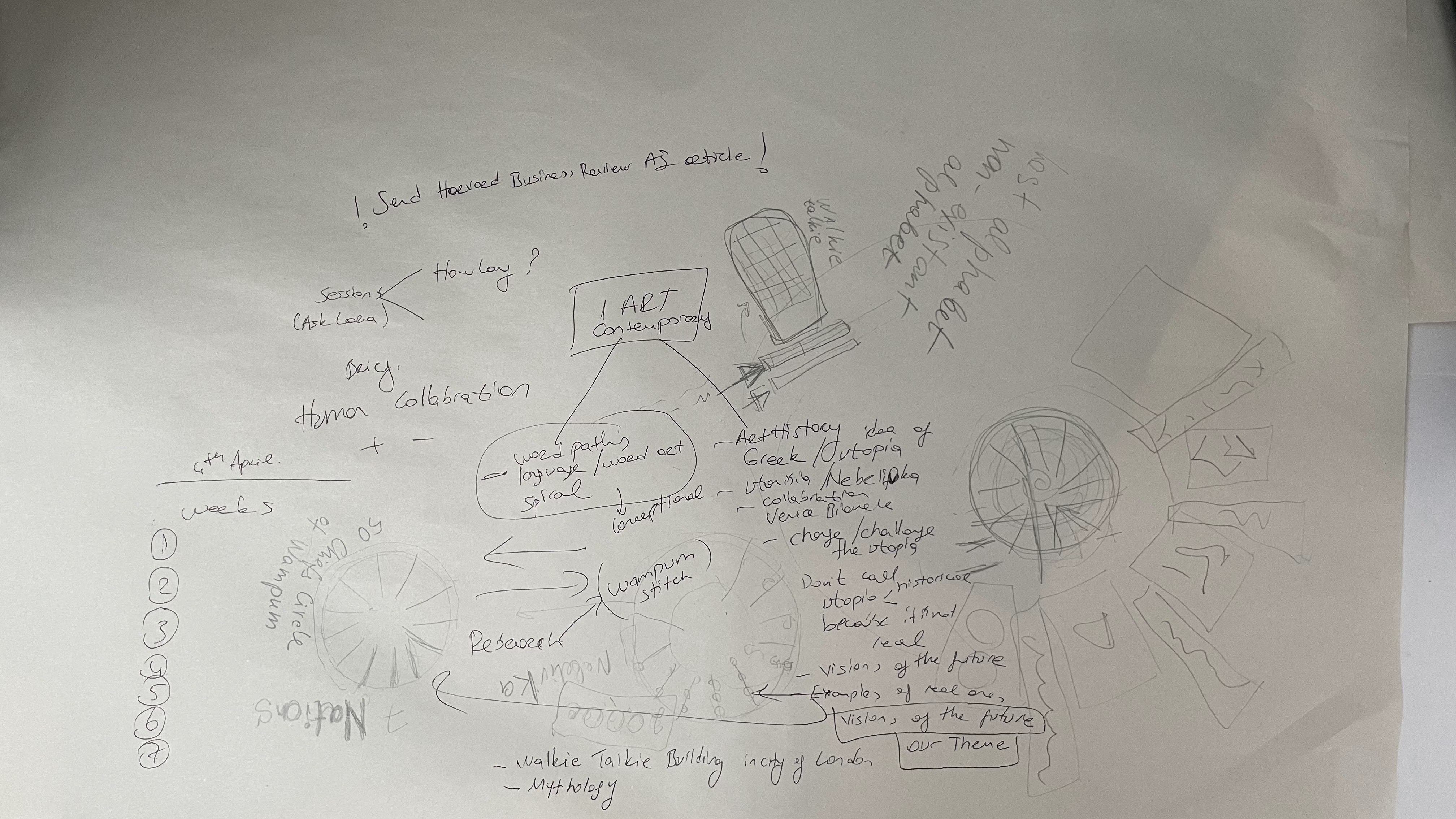 The conversation involves a group planning an art project involving historical and contemporary themes of utopia.AI and Emotions.We discussed dividing tasks among groups such as researching historical utopias.AI’s role in a future utopia and contemporary mentions in science fiction.We also discussed the importance of emotional connection to the project and the need for a work-shop style approach to ensure collaborative creation.