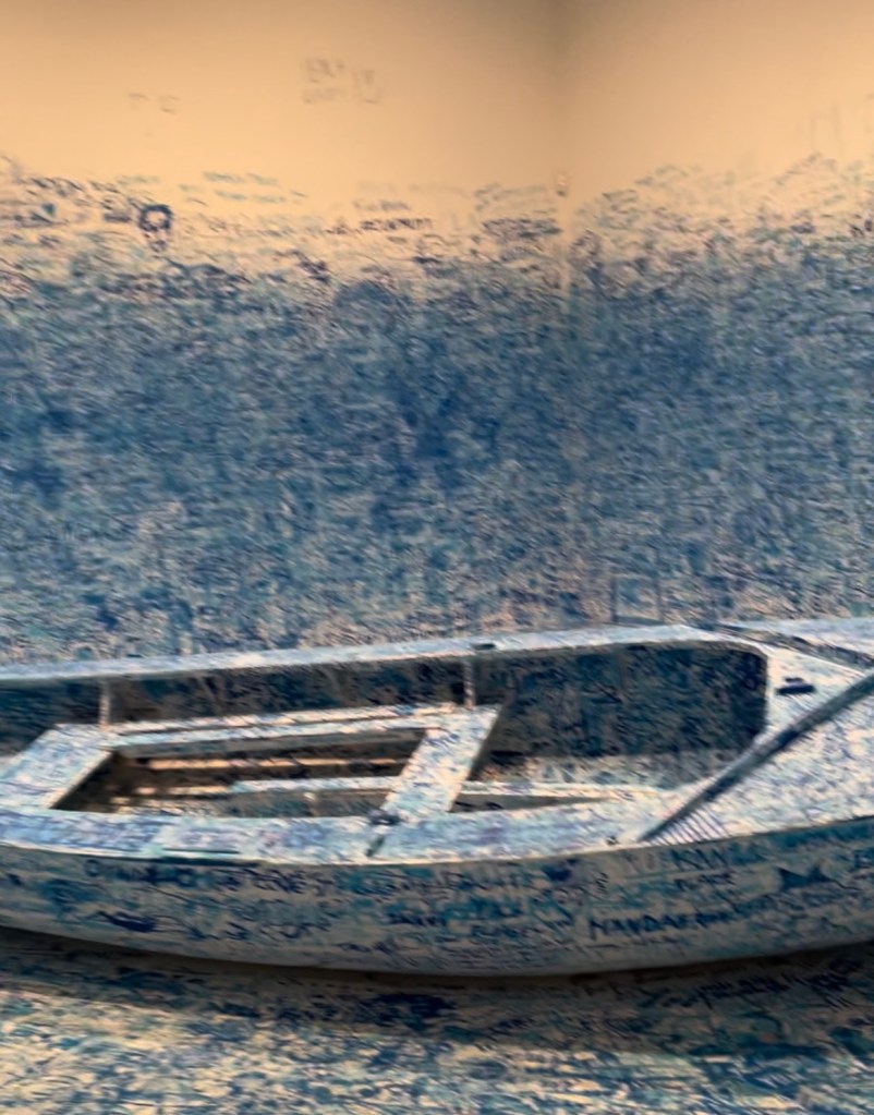 On 2024 March I have visited Yoko Ono ” Music Of The Mind” in Tate Modern.Refugee Boat concept installed is a participatory piece of art by “Yoko Ono” that speaks to the current refugee crisis.Her sculpture and the concept of displaying it just blue like the ocean.’ Visitors are invited to add their hopes and beliefs in shades of blue and white.